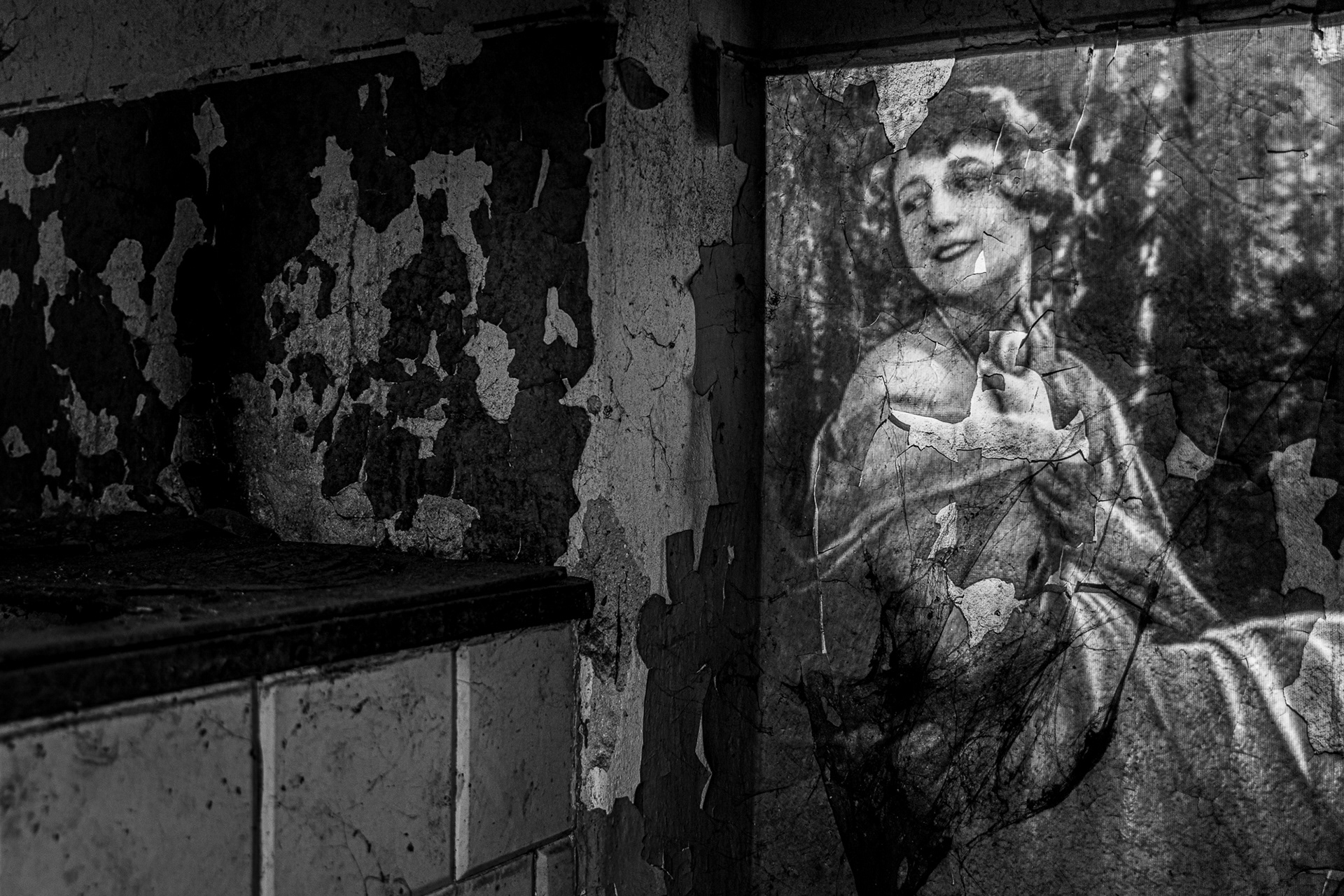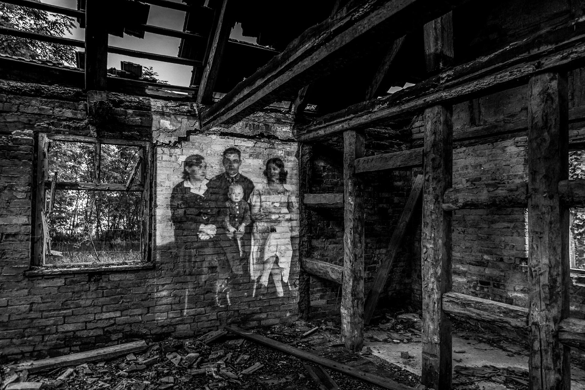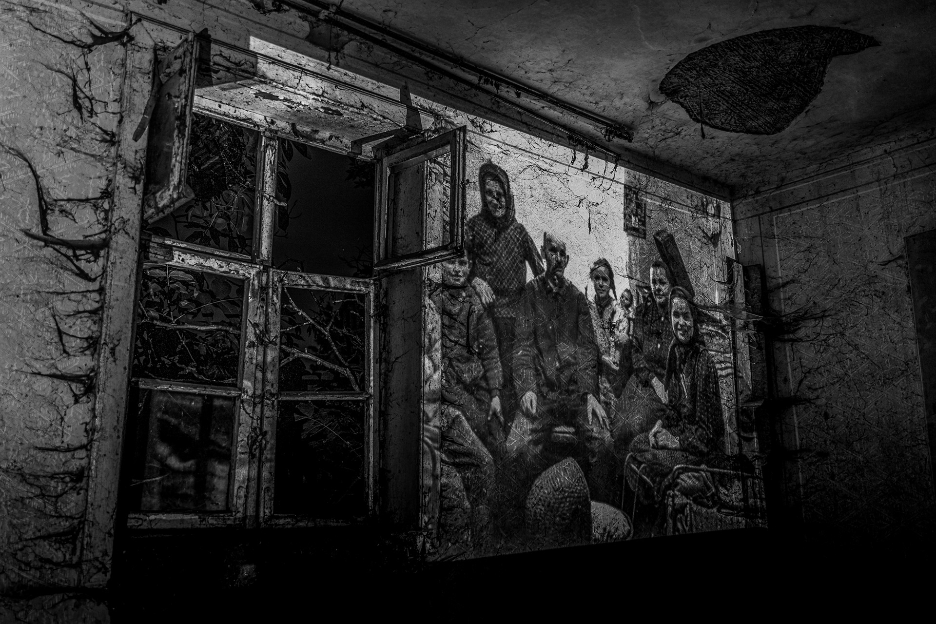 Seria “Retrospektrum” jest impresją autora zauroczonego archiwalnymi fotografiami które kolekcjonuje, ale też zafascynowanego opuszczonymi budynkami, niegdyś tętniącymi życiem, wypełnionymi zapachami - dziś porzuconymi, skrywającymi wiele nieznanych historii. Na fakturach popękanych murów i ścian wyświetla za pomocą rzutnika archiwalne kadry, które na nowo wskrzeszają ducha w te opuszczone miejsca. Przez swoje działanie uchyla nam furtki do tajemniczego świata przeszłości, do tego jak wcześniej mogło wyglądać tu życie.